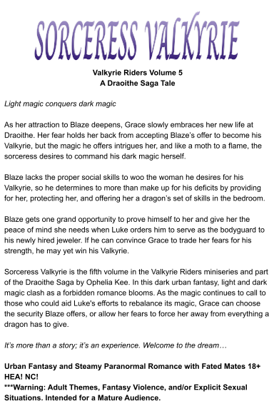 Sorceress Valkyrie is the fifth volume in the Valkyrie Riders miniseries and part of the Draoithe Saga by Ophelia Kee. In this dark urban fantasy, light and dark magic clash as a forbidden romance blooms. As the magic continues to call to those who could aid Luke's efforts to rebalance its magic, Grace can choose the security Blaze offers, or allow her fears to force her away from everything a dragon has to give.