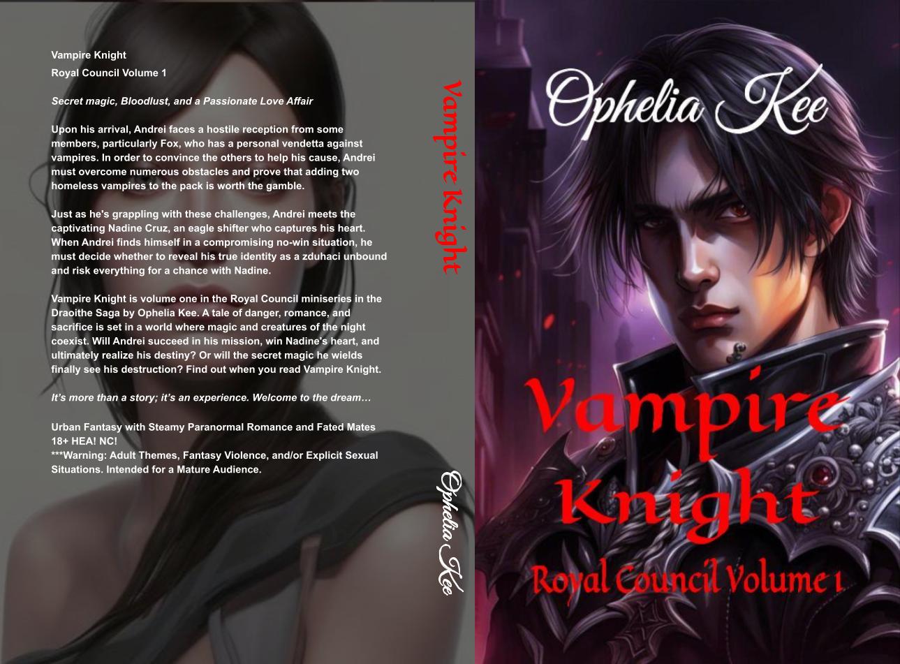 Vampire Knight is volume one in the Royal Council miniseries in the Draoithe Saga by Ophelia Kee. A tale of danger, romance, and sacrifice is set in a world where magic and creatures of the night coexist. Will Andrei succeed in his mission, win Nadine's heart, and ultimately realize his destiny? Or will the secret magic he wields finally see his destruction? Find out when you read Vampire Knight.
