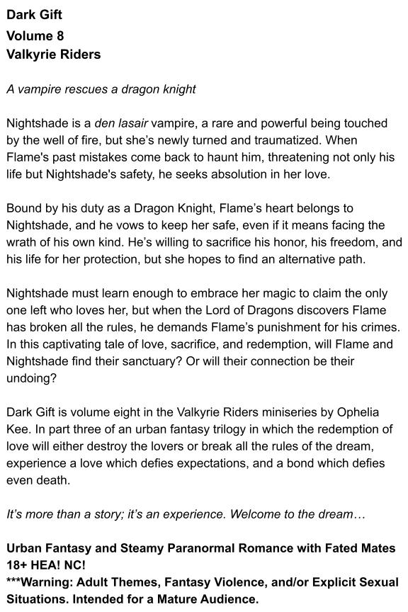 Dark Gift is volume eight in the Valkyrie Riders miniseries by Ophelia Kee. In part three of an urban fantasy trilogy in which the redemption of love will either destroy the lovers or break all the rules of the dream, experience a love which defies expectations, and a bond which defies even death.