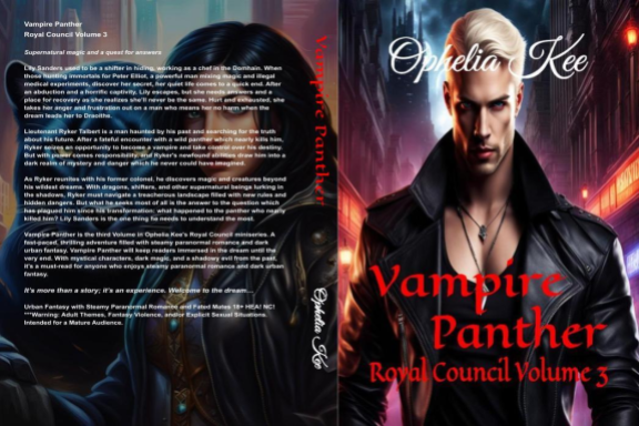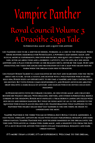 Vampire Panther is the third Volume in Ophelia Kee's Royal Council miniseries. A fast-paced, thrilling adventure filled with steamy paranormal romance and dark urban fantasy. Vampire Panther will keep readers immersed in the dream until the very end. With mystical characters, dark magic, and a shadowy evil from the past, it's a must-read for anyone who enjoys steamy paranormal romance and dark urban fantasy.