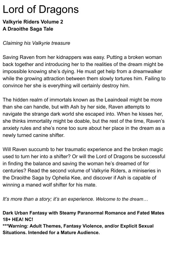 Will Raven succumb to her traumatic experience and the broken magic used to turn her into a shifter? Or will the Lord of Dragons be successful in finding the balance and saving the woman he’s dreamed of for centuries? Read the second volume of Valkyrie Riders, a miniseries in the Draoithe Saga by Ophelia Kee, and discover if Ash is capable of winning a maned wolf shifter for his mate.