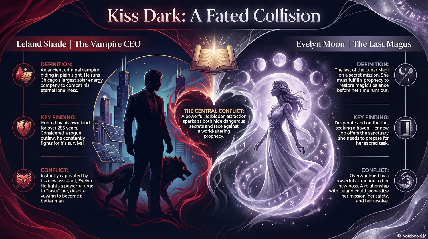 Kiss Dark is the first volume in the dark urban fantasy miniseries Mystic Dark by Ophelia Kee. Set in the dream, this spinoff story from the Draoithe Saga continues the tale of how one lone vampire must alter the Unlikely Kings Prophecy to aid the balance of magic. If you love twisted vampire antiheroes and gifted humans fated to be together but struggling against the inevitable, Kiss Dark is your next read.