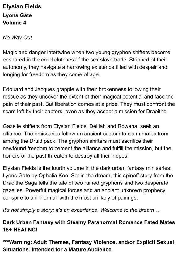 Elysian Fields is the fourth volume in the dark urban fantasy miniseries, Lyons Gate by Ophelia Kee. Set in the dream, this spinoff story from the Draoithe Saga tells the tale of two ruined gryphons and two desperate gazelles. Powerful magical forces and an ancient unknown prophecy conspire to aid them all with the most unlikely of pairings.
