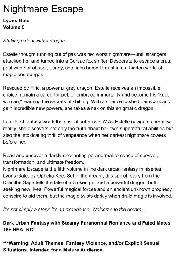 Nightmare Escape is the fifth volume in the dark urban fantasy miniseries, Lyons Gate, by Ophelia Kee. Set in the dream, this spinoff story from the Draoithe Saga tells the tale of a broken girl and a powerful dragon, both seeking new lives. Powerful magical forces and an ancient unknown prophecy conspire to aid them, but the magic twists darkly when druid magic is involved.