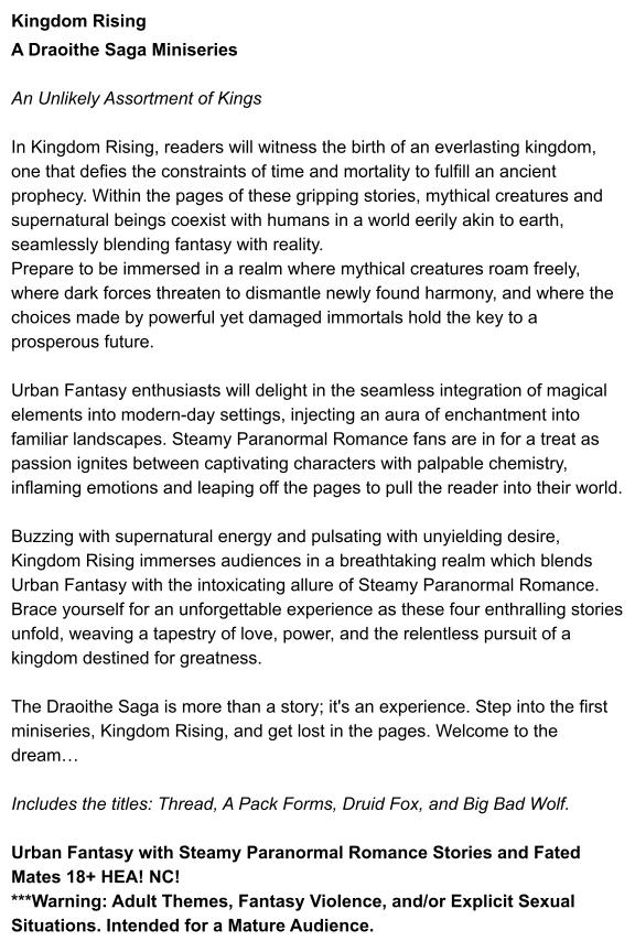 Buzzing with supernatural energy and pulsating with unyielding desire, Kingdom Rising immerses audiences in a breathtaking realm which blends Urban Fantasy with the intoxicating allure of Steamy Paranormal Romance. Brace yourself for an unforgettable experience as these four enthralling stories unfold, weaving a tapestry of love, power, and the relentless pursuit of a kingdom destined for greatness.