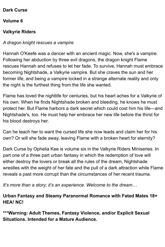 Dark Curse by Ophelia Kee is volume six in the Valkyrie Riders Miniseries. In part one of a three part urban fantasy in which the redemption of love will either destroy the lovers or break all the rules of the dream, Nightshade wrestles with the weight of her fate and the pull of a dark attraction while Flame reveals a past more corrupt than the circumstances of her recent trauma.