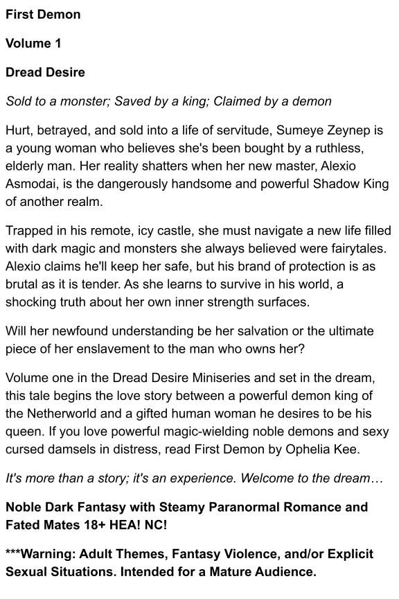 Volume one in the Dread Desire Miniseries and set in the dream, this tale begins the love story between a powerful demon king of the Netherworld and a gifted human woman he desires to be his queen. If you love powerful magic-wielding noble demons and sexy cursed damsels in distress, read First Demon by Ophelia Kee.