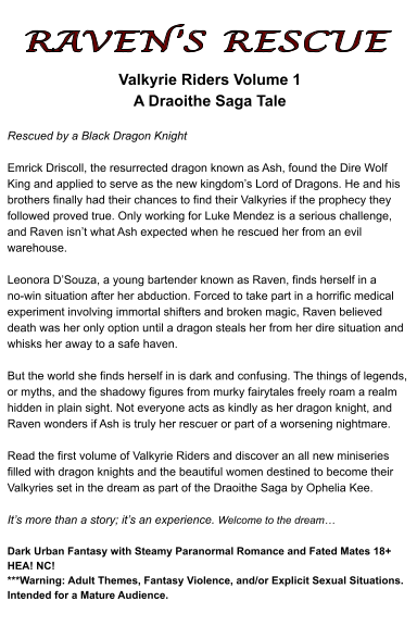 Read Raven's Rescue, the first volume of Valkyrie Riders, and discover an all-new miniseries filled with dragon knights and the beautiful women destined to become their Valkyries, set in the dream as part of the Draoithe Saga by Ophelia Kee.